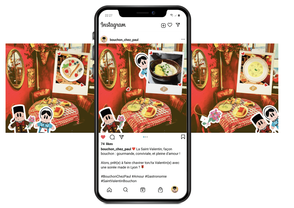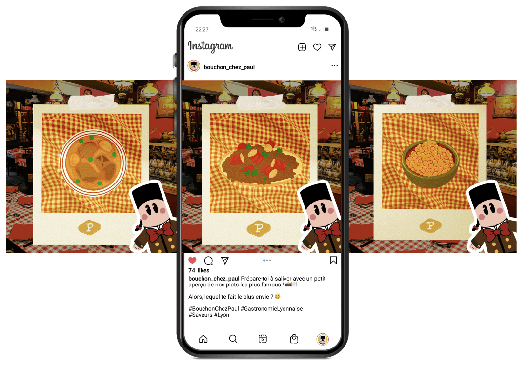 Bouchon Chez Paul souhaite dynamiser sa clientèle quotidienne, en attirant aussi bien les amateurs de déjeuner que ceux du dîner. Pour cela, nous concevons une campagne social media originale et impactante, qui reflète pleinement sa nouvelle identité visuelle.