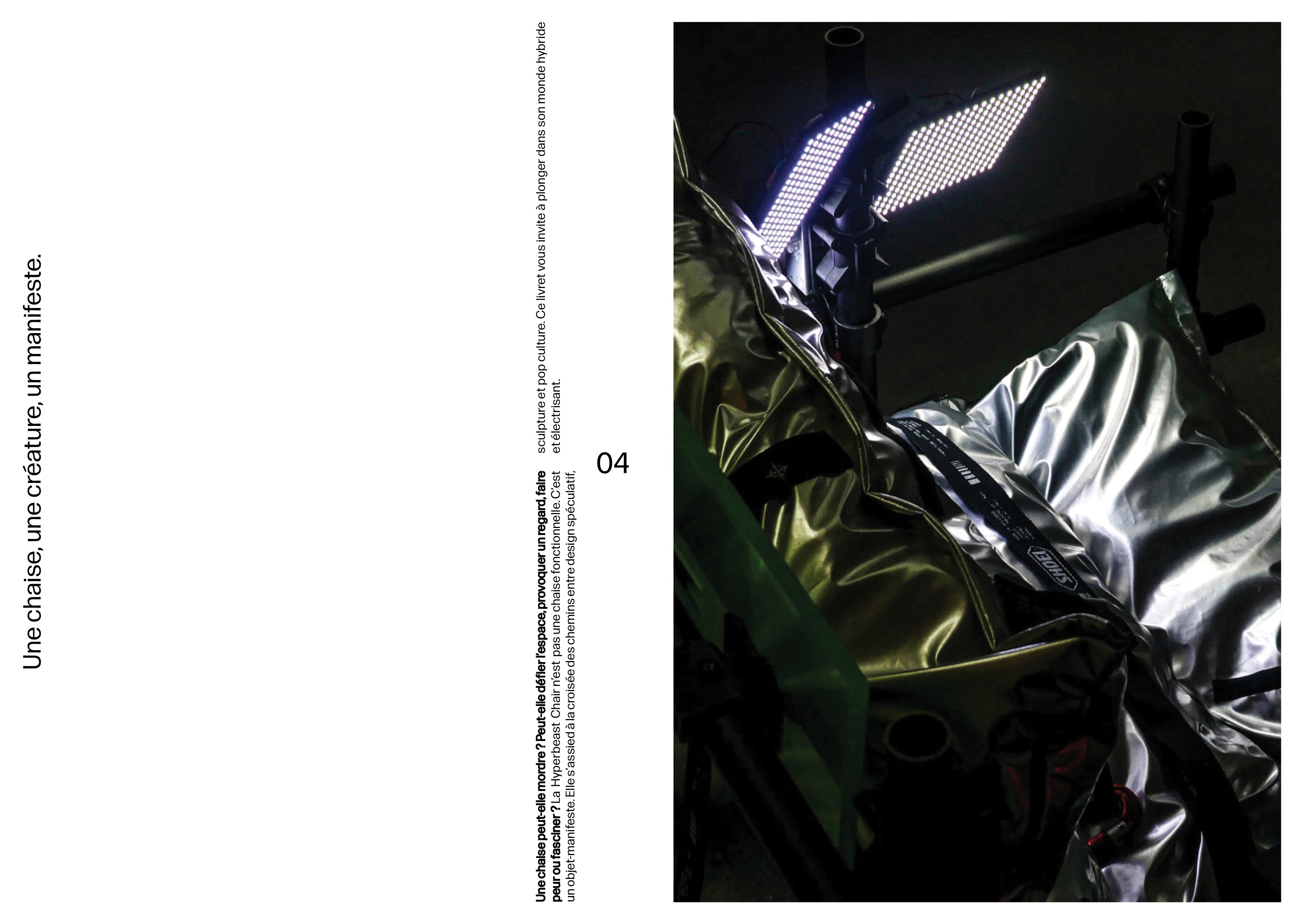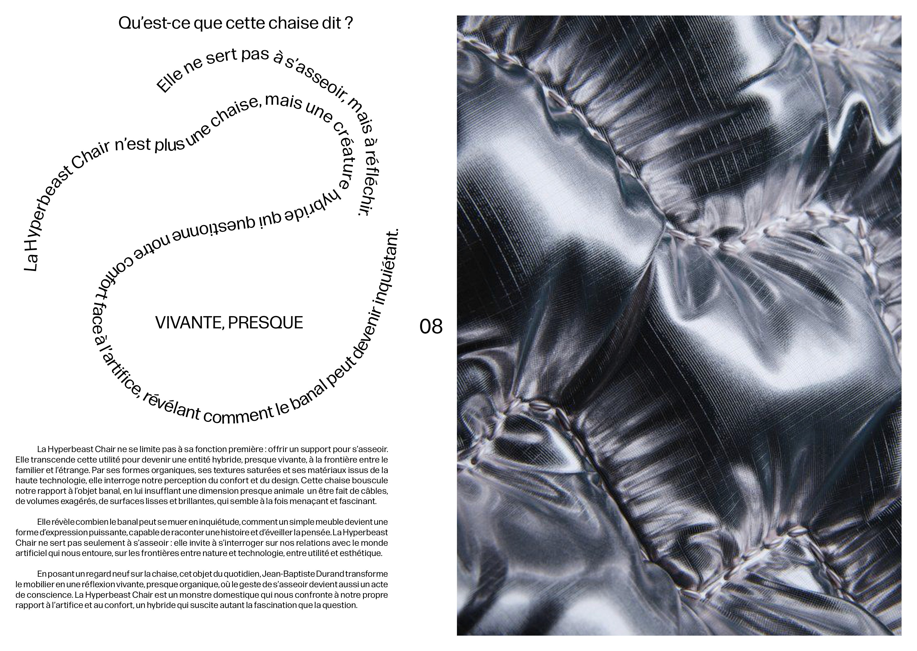 Ce livret est né d’un trouble : la Hyperbeast Chair m’a tout de suite échappé. Plus qu’un simple siège, elle m’est apparue comme un corps en mutation, entre objet et organisme. Elle semblait vivante, étrange, presque animale.